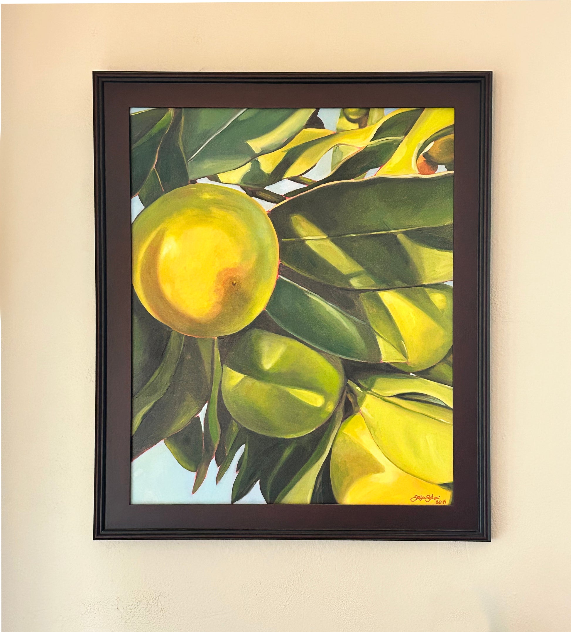 Bursting with vibrant shades of green and gold, this 24 x 30 original oil painting beautifully captures a cluster of kumquats nestled among lush leaves. The play of sunlight and shadows brings a fresh, lively energy to the piece.