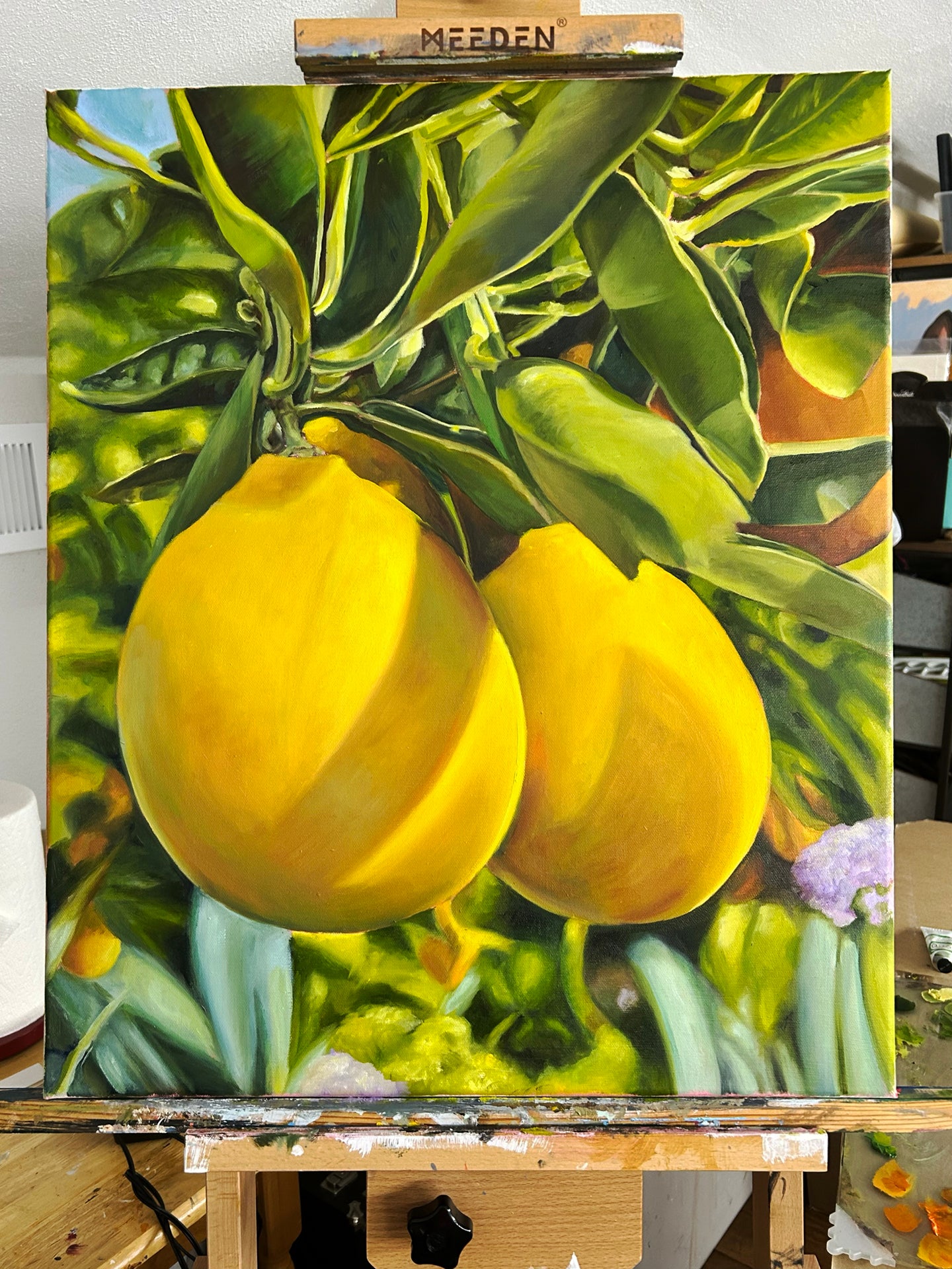 Two golden pears lemonsibrant oil painting adds a fresh pop of color and playful energy to any room. Oil on 16 x 20 canvas, 5/8" deep.