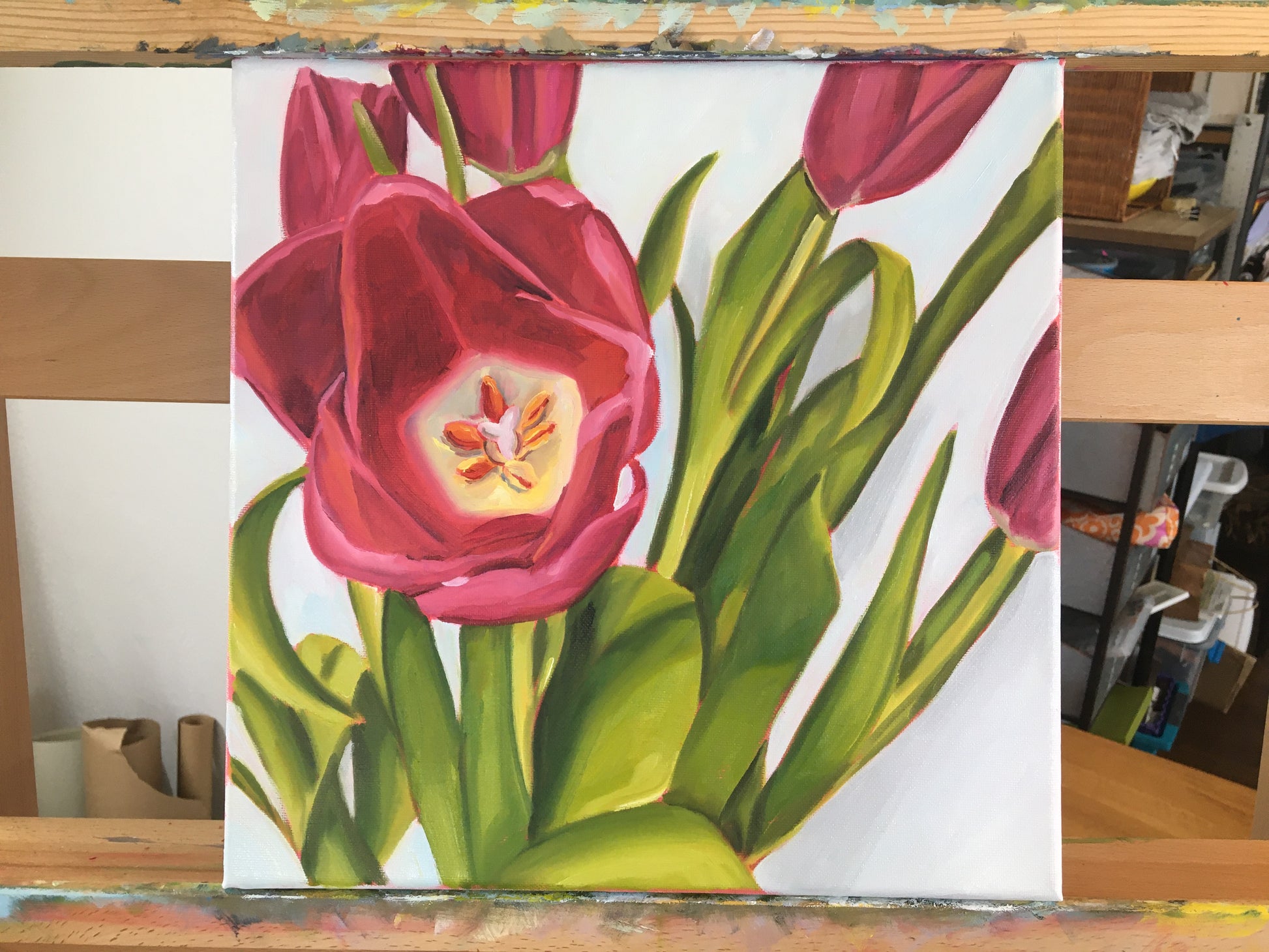 A delicate and colorful rendition of Tulips as a 12 x12 oil painting.